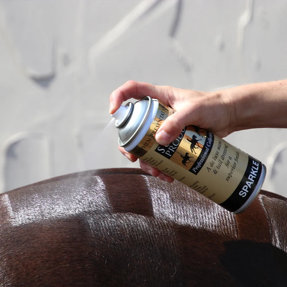 A Superior mane and tail dressing which produces body, glamour and shine. Sparkle can be used as an all over body 'extra.' This product is fantastic for use on sunny days and under artificial light - a 'must' for evening performances! Does not contain glitter